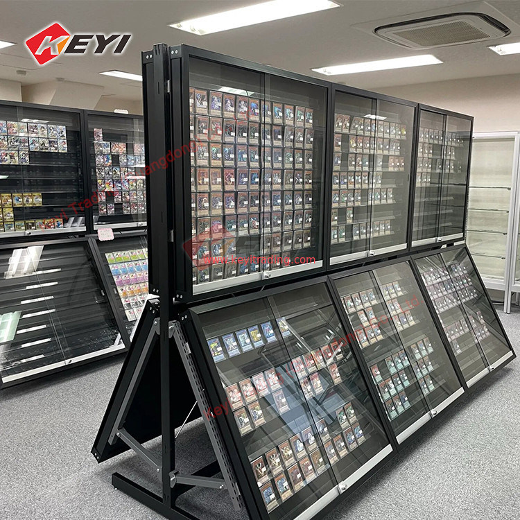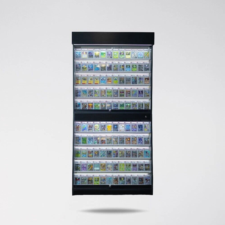 Feature highlights: This retail display case is designed for graded trading and sports card displays, It fits motst of style cards, such as PSA card, TCG card, graded cards with slab, standard Pokemon cards and so on. Featuring LED lighting and lockable sliding doors. It is made of wood, glass, and customizable materials, suitable for stores, supermarkets, and shopping malls and exhibitions. The pre-assemble construction design eliminates the hassle of installation. Custom sizes and colors are available, making it versatile for various indoor applications.