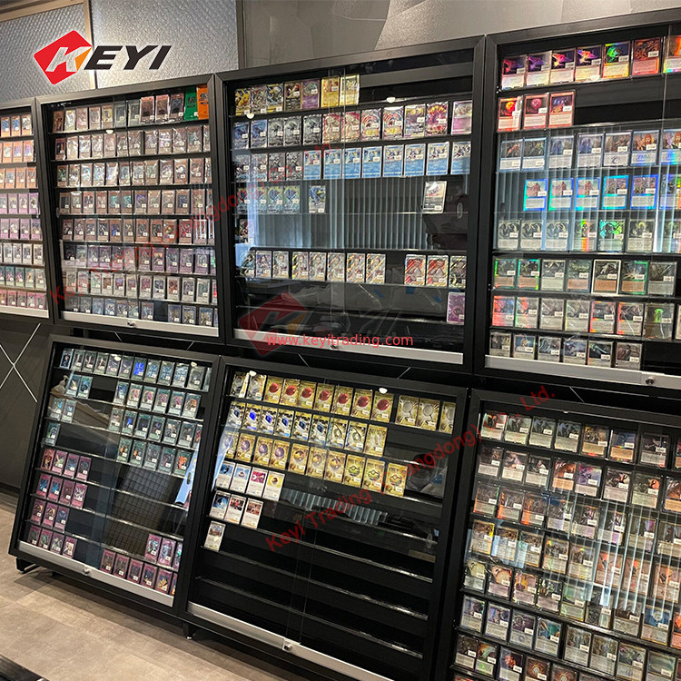 This retail display case is designed for graded trading and sports card displays, featuring adjustable height shelves and lockable doors. It is made of metal, acrylic and customizable materials, suitable for retail stores, supermarkets, shopping malls, and exhibitions, trade show, ect. It fits motst of style cards, such as PSA card, TCG card, graded cards with slab, standard Pokemon cards and so on. The knock-down construction saves shipping costs and ensures easy assembly with an instruction sheet. Custom sizes and colors are available, making it versatile for various indoor applications.