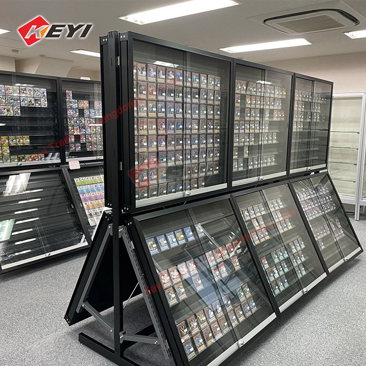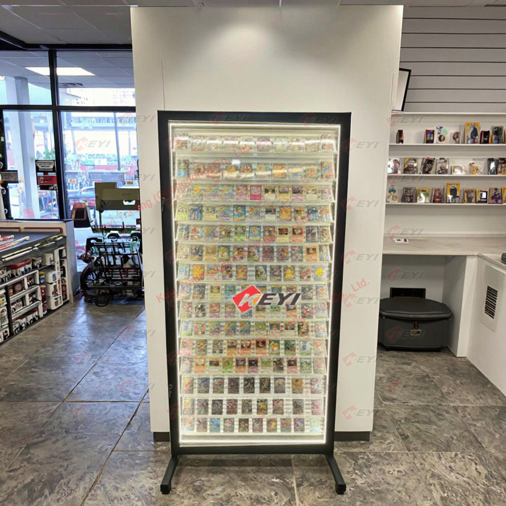 This retail display case is designed for graded trading and sports card displays, featuring adjustable height shelves and lockable doors. It is made of metal, acrylic and customizable materials, suitable for retail stores, supermarkets, shopping malls, and exhibitions, trade show, ect. It fits motst of style cards, such as PSA card, TCG card, graded cards with slab, standard Pokemon cards and so on. The knock-down construction saves shipping costs and ensures easy assembly with an instruction sheet. Custom sizes and colors are available, making it versatile for various indoor applications.