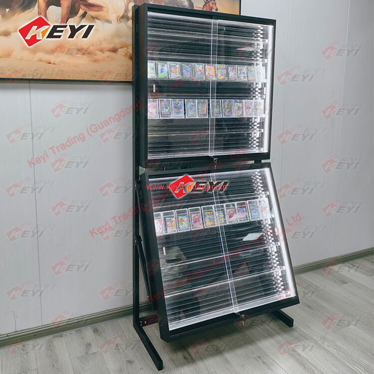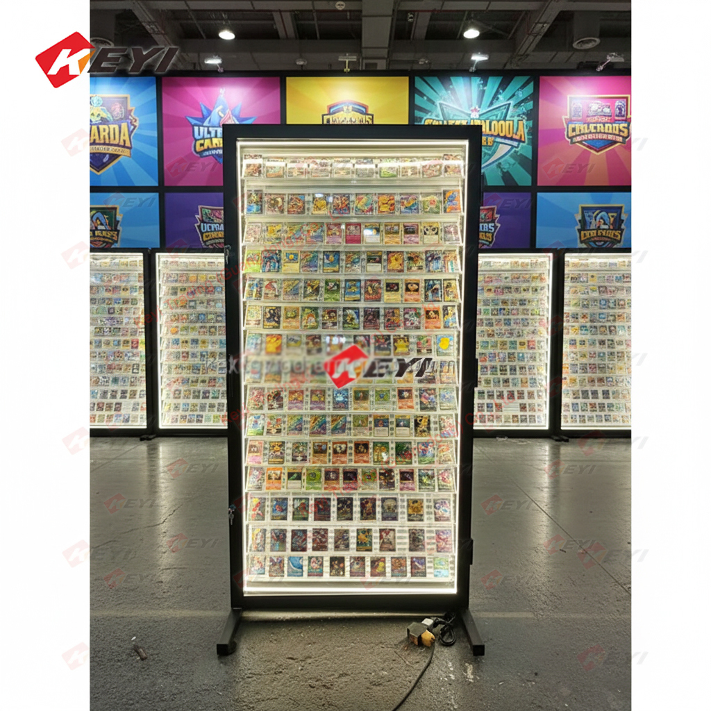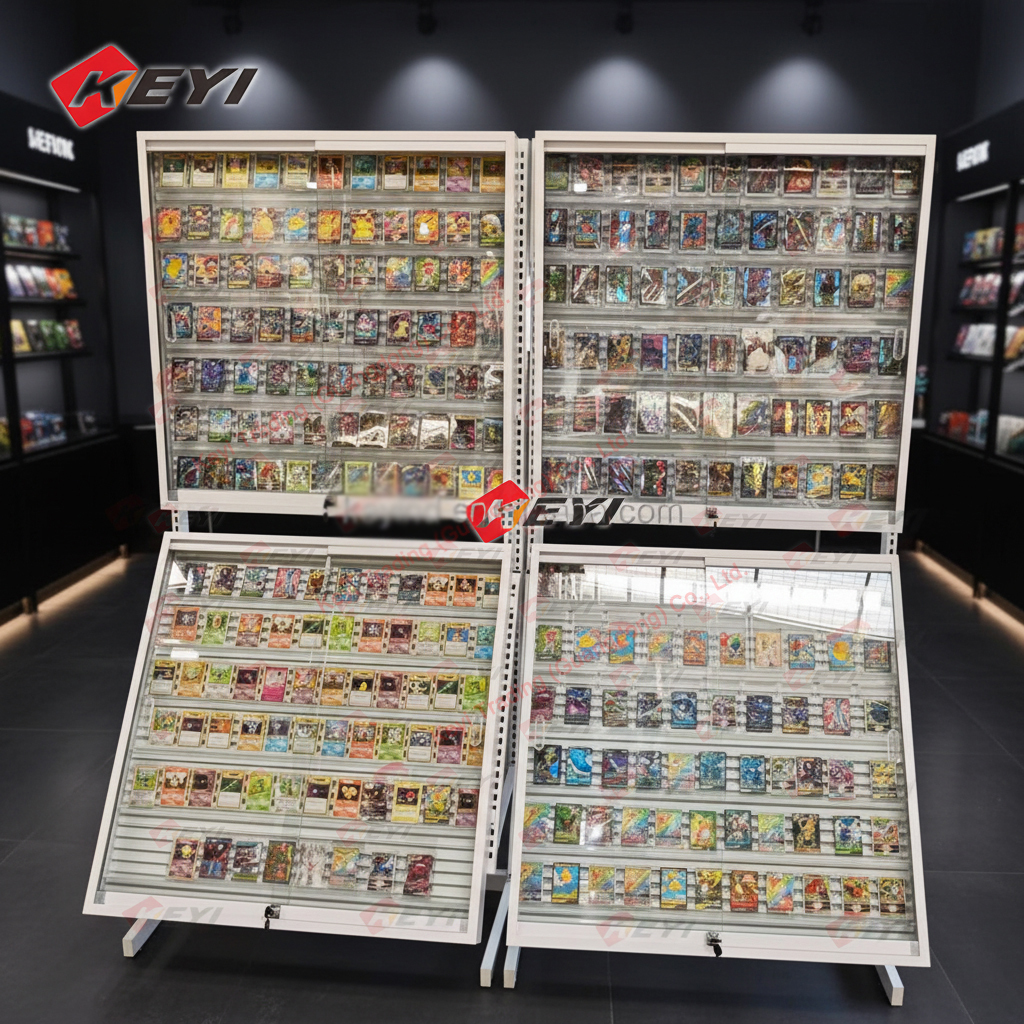 This retail display case is designed for graded trading and sports card displays, featuring adjustable height shelves and lockable doors. It is made of metal, acrylic and customizable materials, suitable for retail stores, supermarkets, shopping malls, and exhibitions, trade show, ect. It fits motst of style cards, such as PSA card, TCG card, graded cards with slab, standard Pokemon cards and so on. The knock-down construction saves shipping costs and ensures easy assembly with an instruction sheet. Custom sizes and colors are available, making it versatile for various indoor applications.